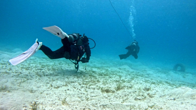 水中ガイドのシミュレーションを行うDM(ダイブマスター)など